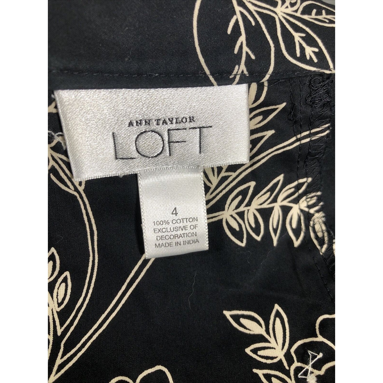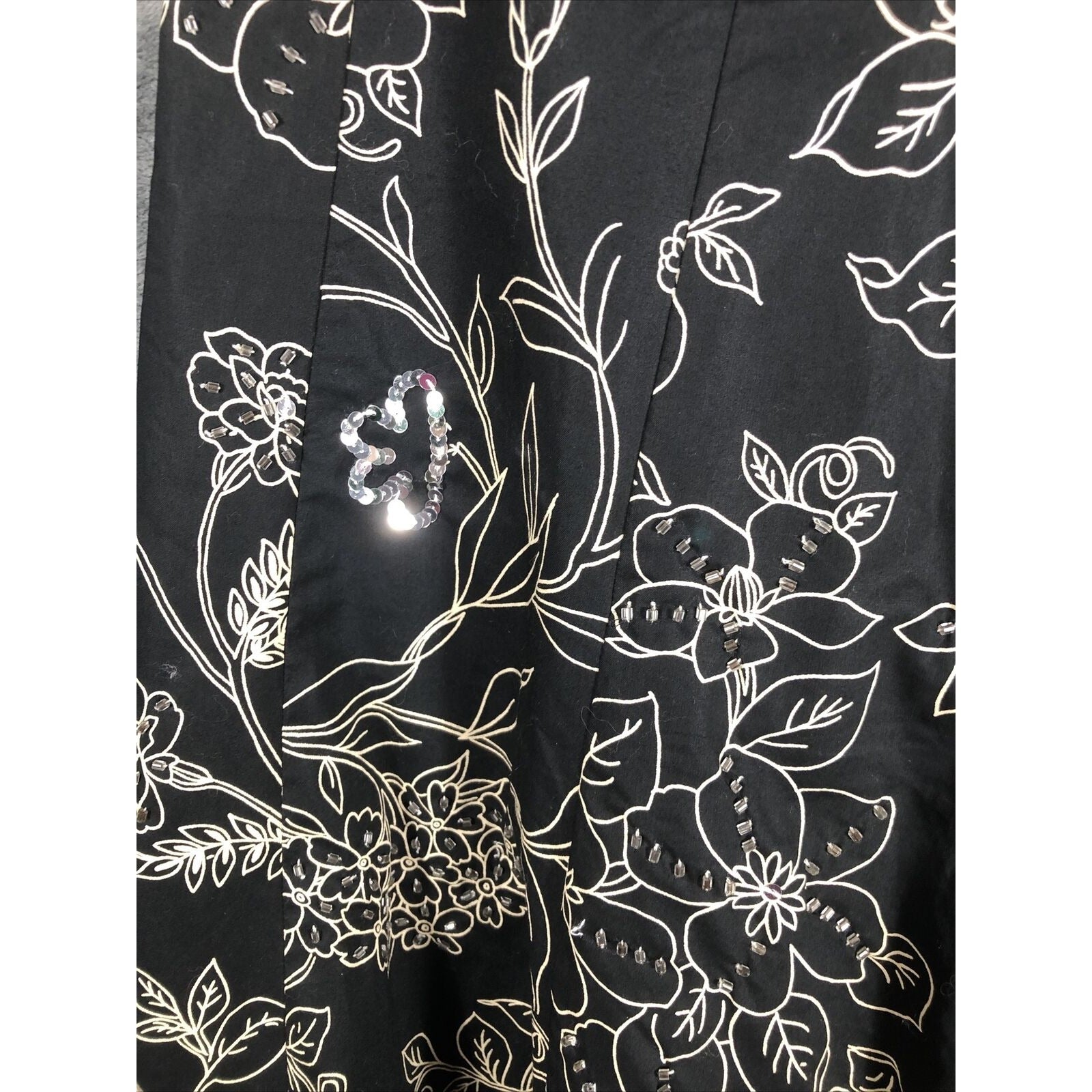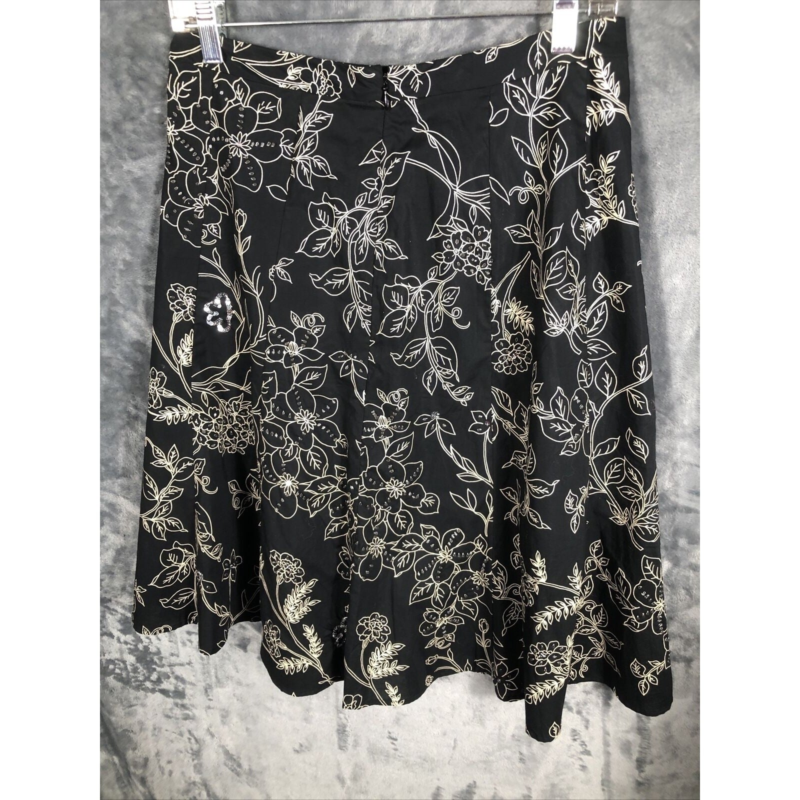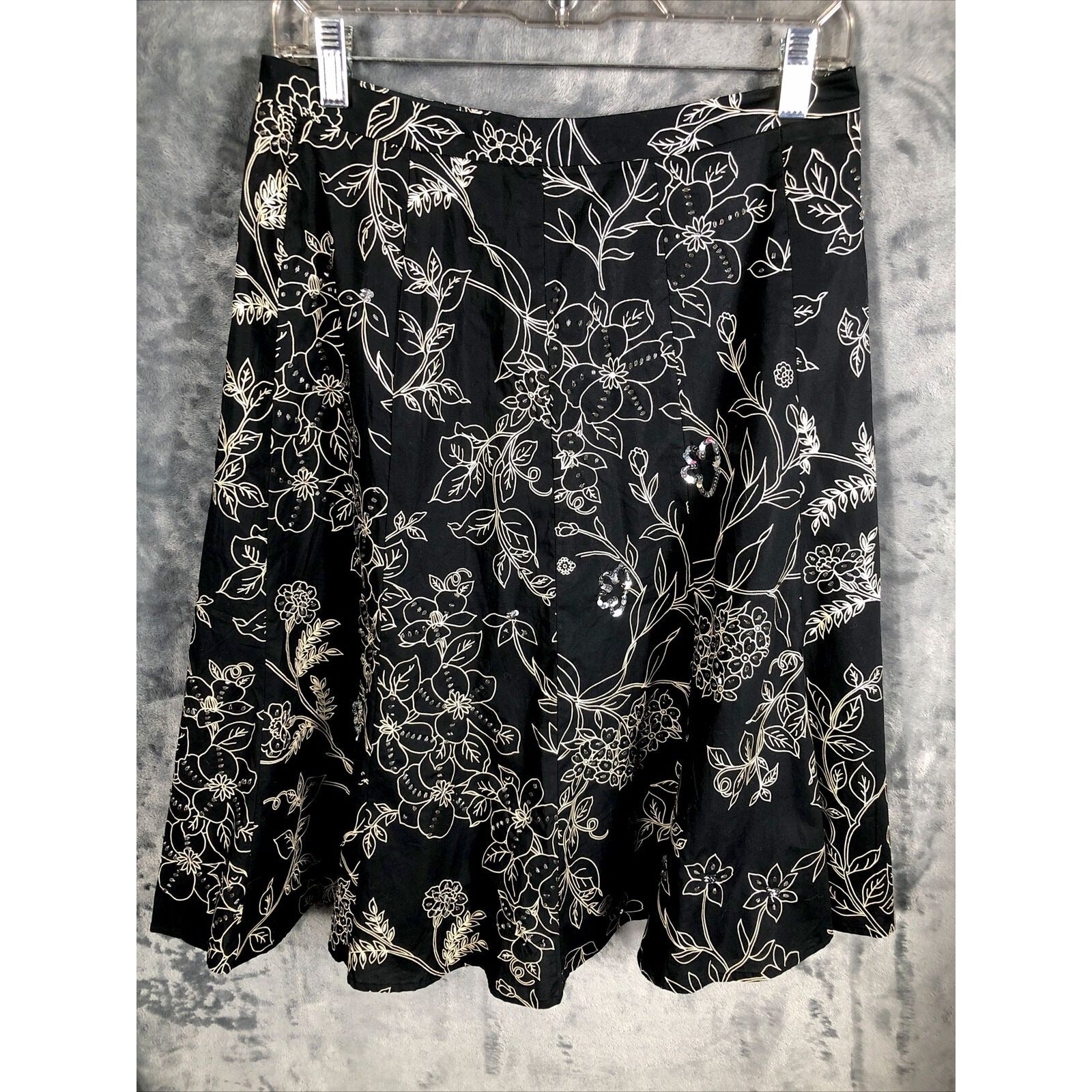 This is a pre-owned Ann Taylor Loft skirt for women. It has a black floral pattern with sequined accents and a zip closure. The skirt is knee-length with a mid-rise and a flare style. It is made of lightweight cotton knit fabric and is machine washable. The skirt is suitable for various occasions including travel, weddings, parties, casual wear, workwear, and business. It is available in size regular 4 and was manufactured in India. The skirt is suitable for all seasons including winter, summer, fall, and spring.