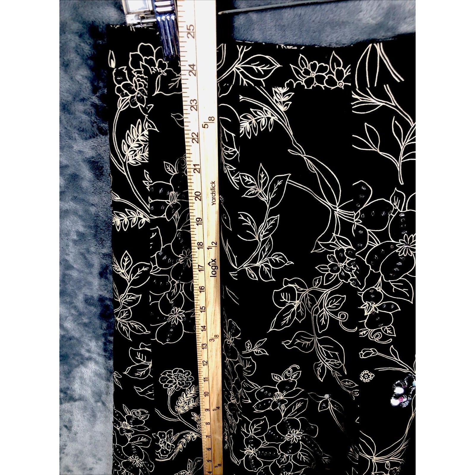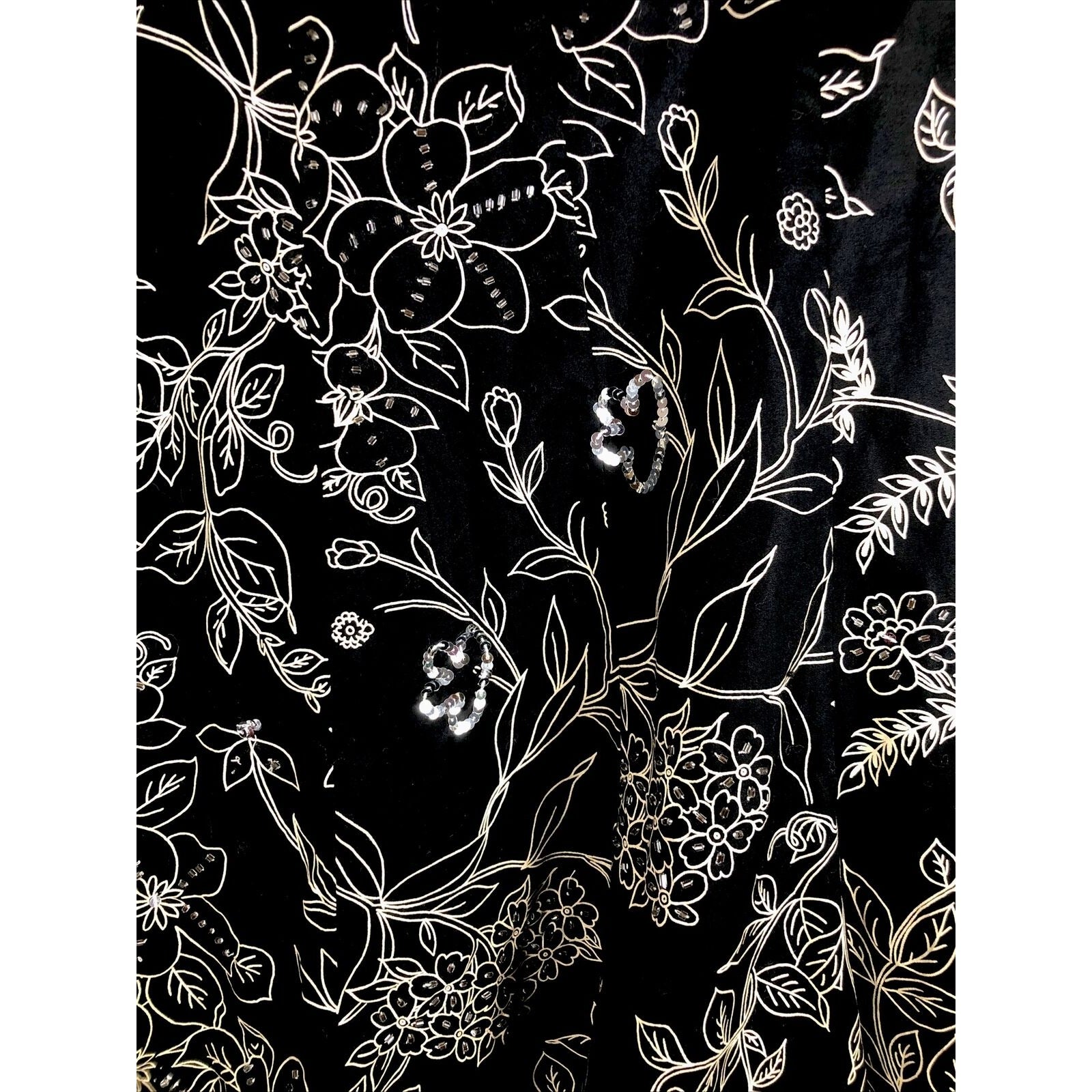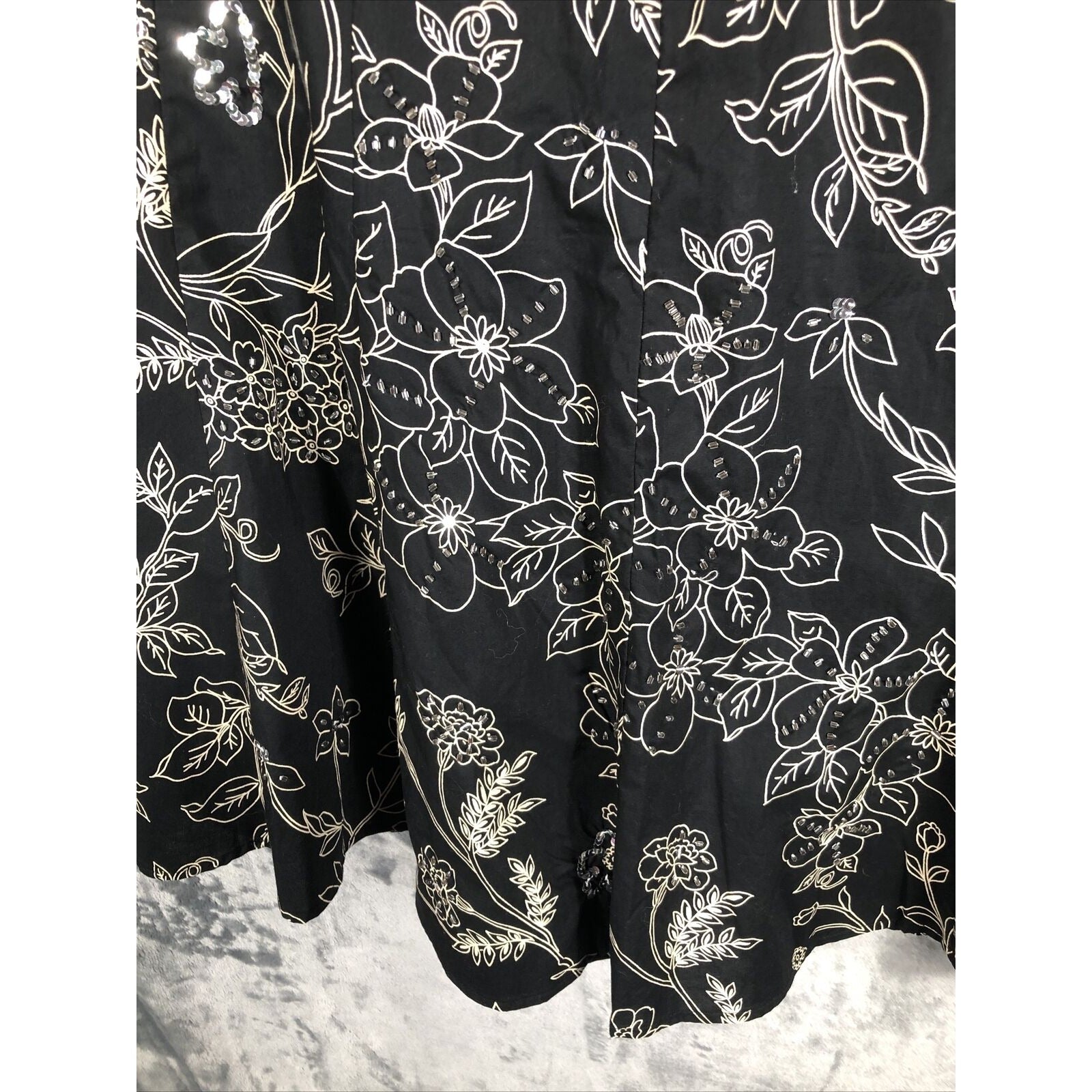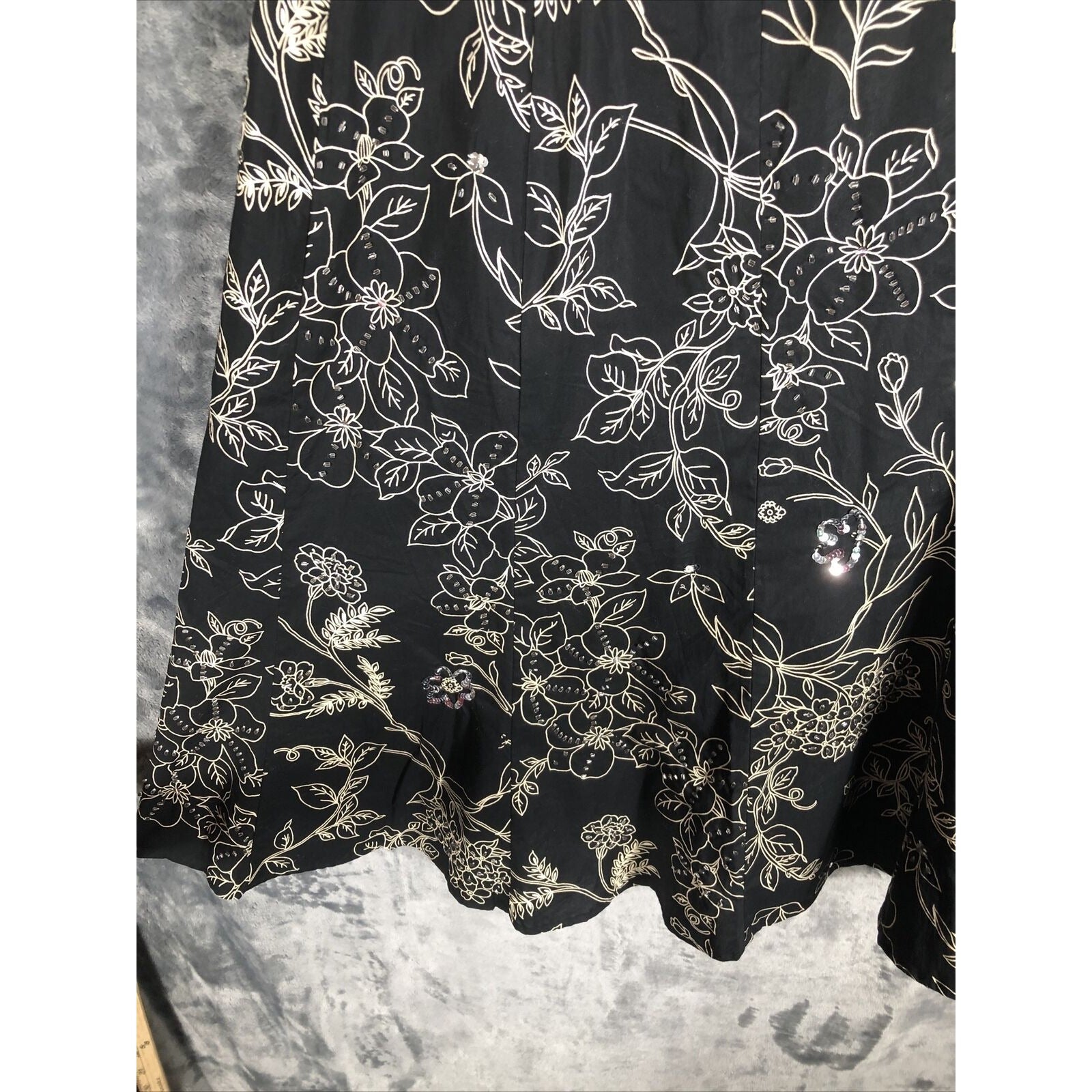 This is a pre-owned Ann Taylor Loft skirt for women. It has a black floral pattern with sequined accents and a zip closure. The skirt is knee-length with a mid-rise and a flare style. It is made of lightweight cotton knit fabric and is machine washable. The skirt is suitable for various occasions including travel, weddings, parties, casual wear, workwear, and business. It is available in size regular 4 and was manufactured in India. The skirt is suitable for all seasons including winter, summer, fall, and spring.