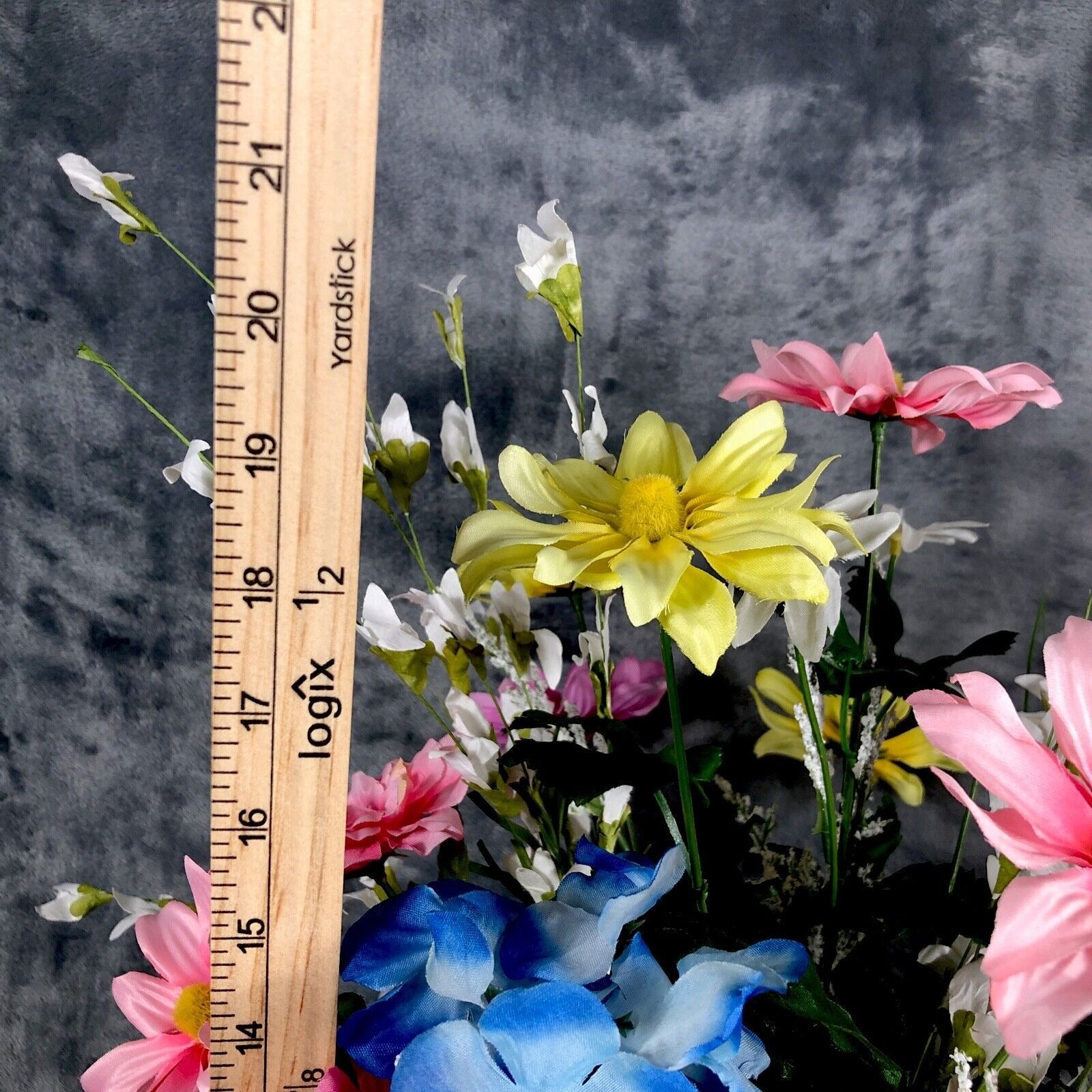 This is a new artificial silk flower arrangement handmade in the United States. The bouquet features multicolor flowers and has a spring theme. It stands at 21 inches tall and is 20 inches wide. The arrangement is perfect for home decor and falls under the floral decor category.