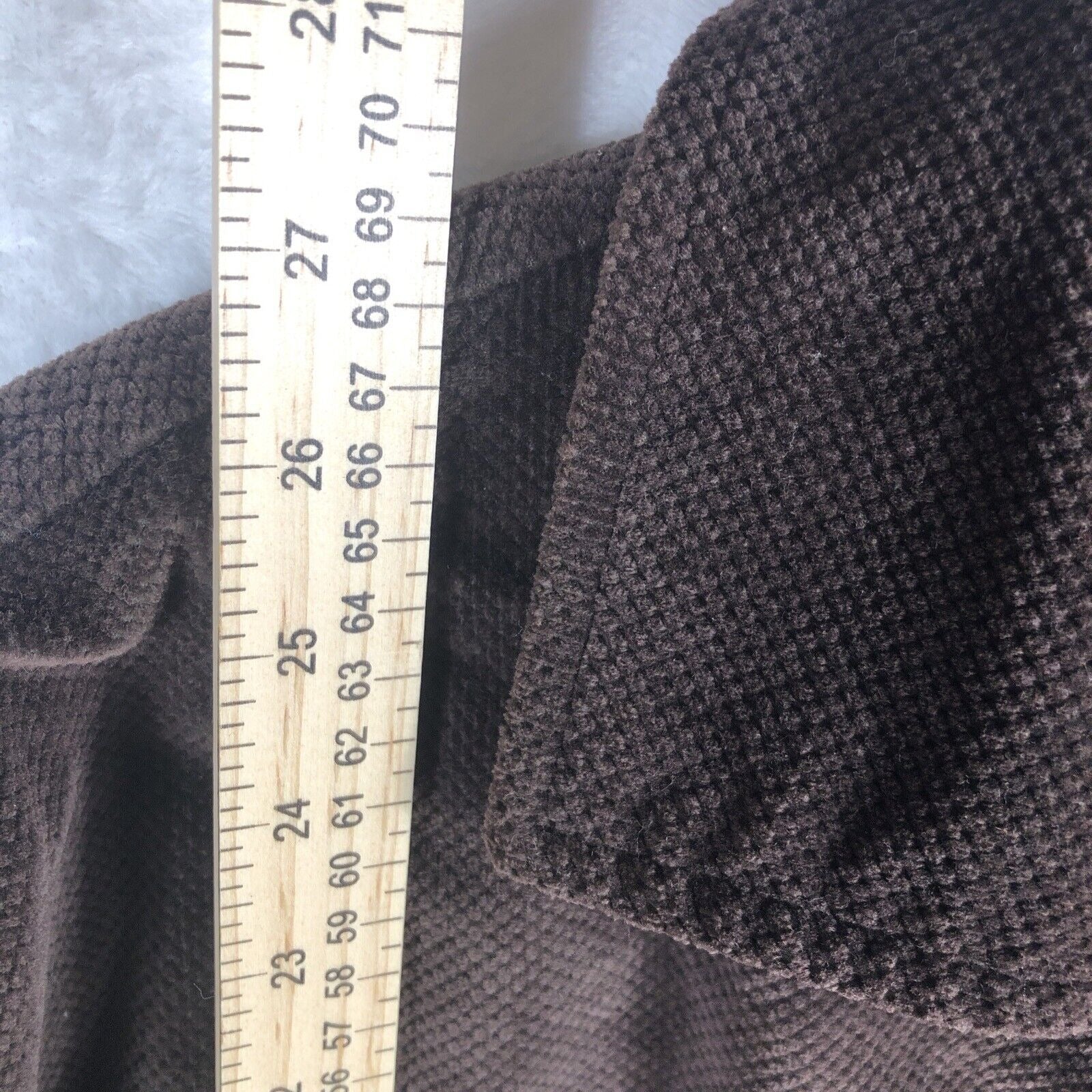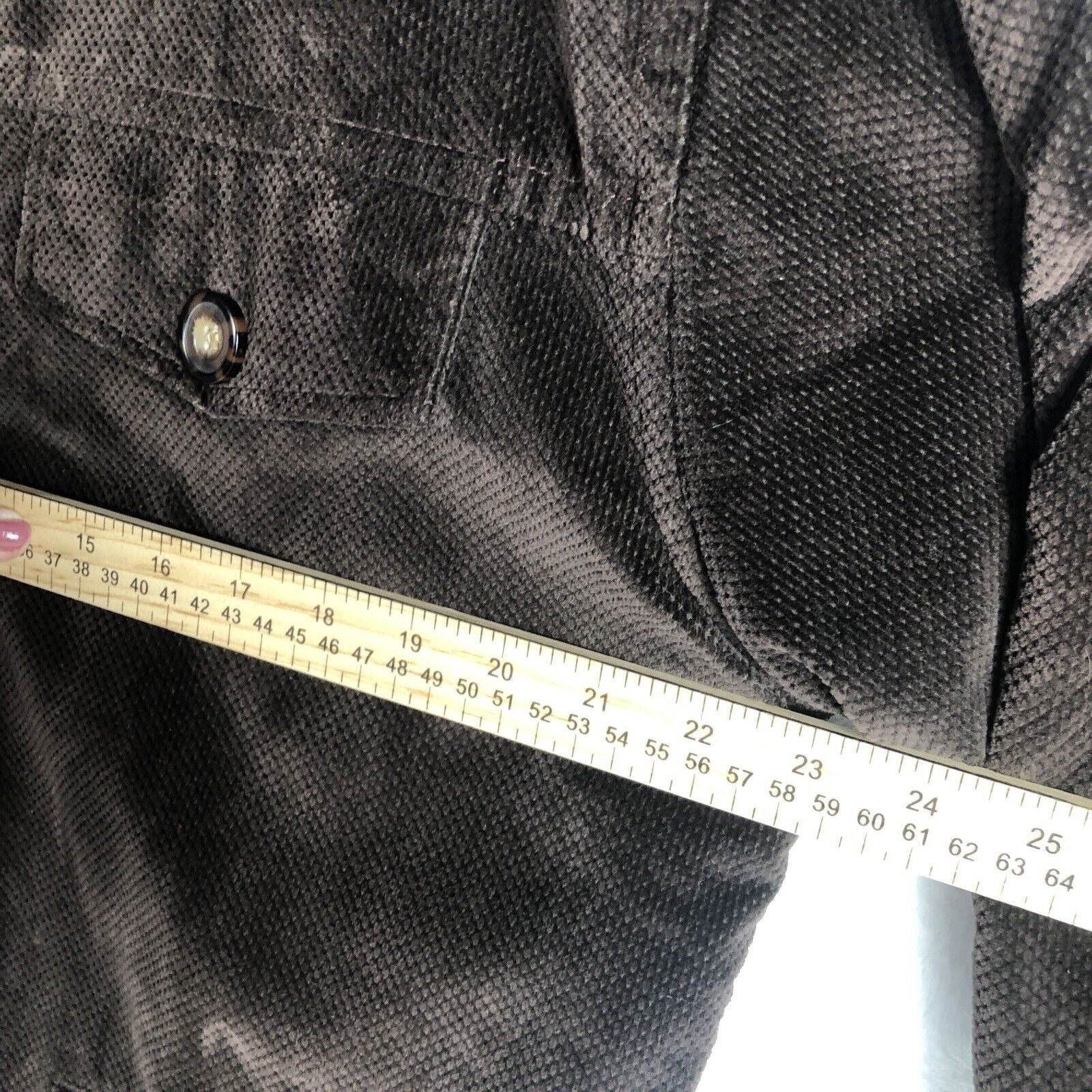 Introducing the Saint Johns Bay Authentic Woman's Brown Corduroy Button Up Coat in adult medium size. This stylish and versatile coat is perfect for travel, casual wear, workwear, or business attire. The mid-length coat is made from high-quality cotton and features a solid brown pattern, button closure, and nylon lining.